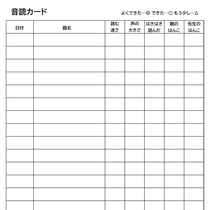 「日付」「題名」の記入欄、「読む速さ」「声の大きさ」「はきはき読んだか」の評価欄、「先生が印を押す」欄、「保護者が印を押す」欄があります。