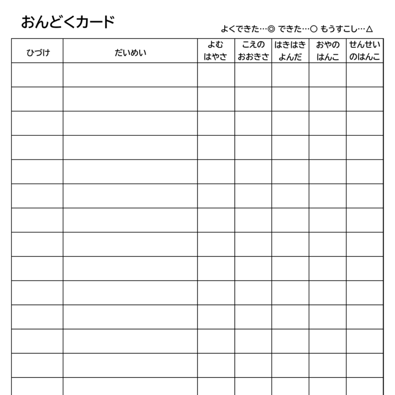 「日付」「題名」の記入欄、「読む速さ」「声の大きさ」「はきはき読んだか」の評価欄、「先生が印を押す」欄、「保護者が印を押す」欄があります。